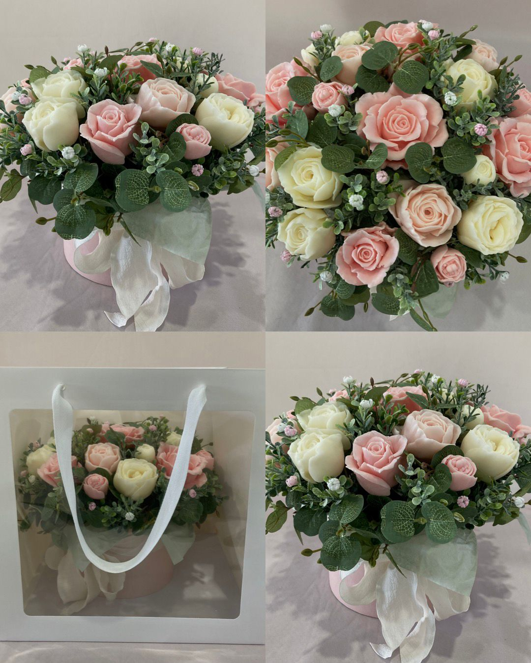 Букеты из мыла, которые можно уже сейчас приобрести в магазине «Дом обуви», выглядят очень естественно. Они долговечные, совершенно не требуют ухода. У них приятный ненавязчивый аромат. Такие цветы не завянут и спустя год! Стоимость мыльных букетов начинается от 190 рублей. В подарок к букету - красивая открытка.