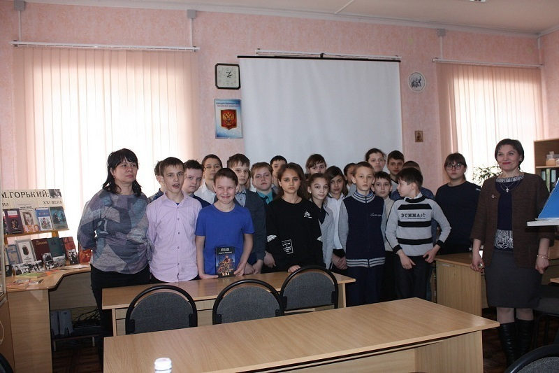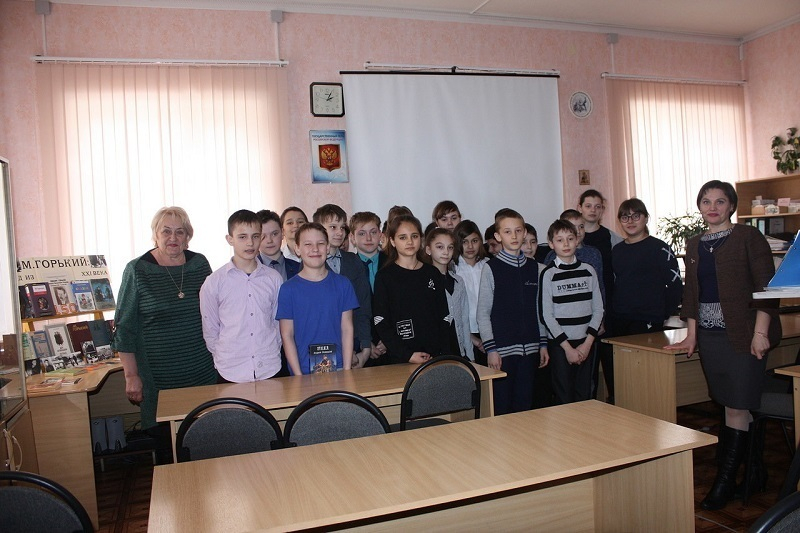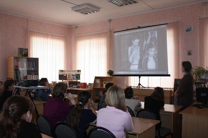 19 марта библиотекарь Детского отдела им. Н. К. Крупской Л. Н. Тимченко пригласила учащихся 6 классов МБОУ СОШ №4 (Кл. руководители Войнова Н. Н. и Гордиенко В.В.) на литературный час «Человек – это звучит гордо», посвящённый 150-летию со дня рождения писателя.