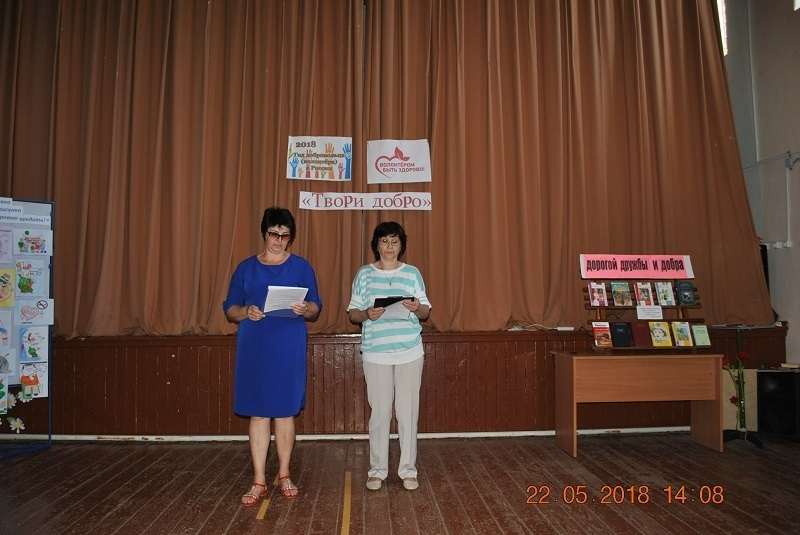 Ведущими мероприятия были библиотекарь Н.Д.Ткачева и кутльторганизатор Л.А.Иванова. Началось мероприятие со стихотворения «Я волонтер». Ведущие рассказали ребятам историю основания волонтерского движения, чем занимаются волонтеры. В зале были развешены плакаты «Волонтером быть здорово!», так же была оформлена книжная выставка «Дорогой дружбы и добра».